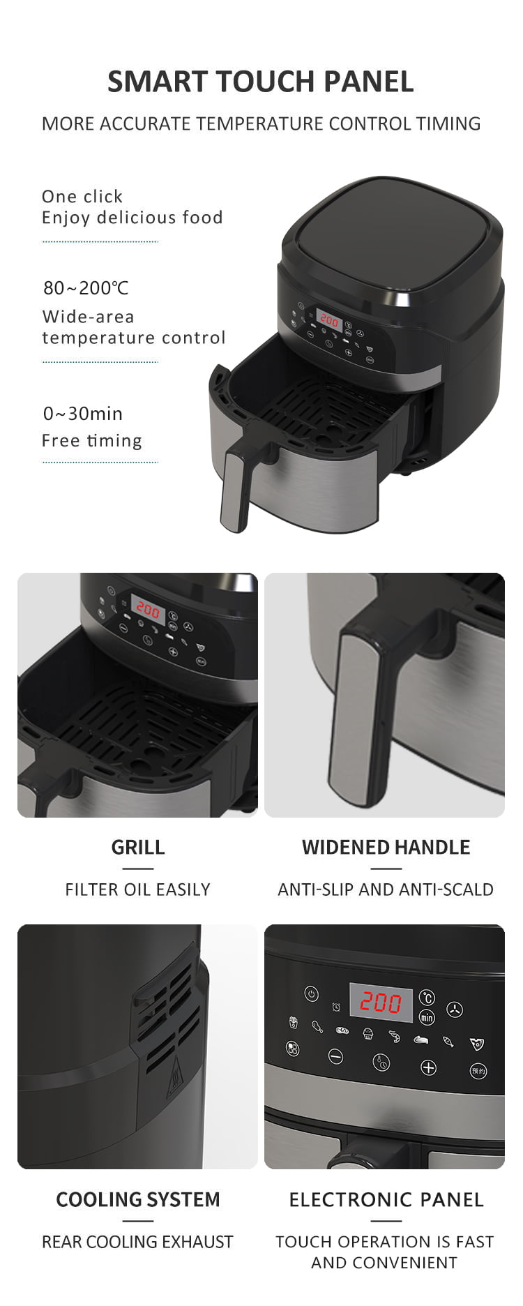 YYZG-550AS, un panou tactil de 5,5 ani de la Teach Temperation Timer Control Fritery. Porbind un panou digital pentru o funcționare fără probleme și scurtă, acest aparat prioritizează protecția cu caracteristica sa de siguranță supraîncălzită. Bucurați-vă de puterea sincronizării neîngrijite, de la 0 la jumătate de oră, permițându-vă să personalizați duratele de coacere fără efort. Suprafața de gătit antiaderentă de înaltă calitate asigură o curățare ușoară, în același timp cu funcționarea de 8 meniuri inteligente încorporate. Distribuția rapidă și chiar a aerului cald caracterizează procesul său de gătit, vânzând mai multe rezultate sănătoase cu mult mai puțin ulei. Structura sertarului de utilizator-plăcut îmbunătățește confortul, facilitând încărcarea și descărcarea fără probleme a vaselor preferate.